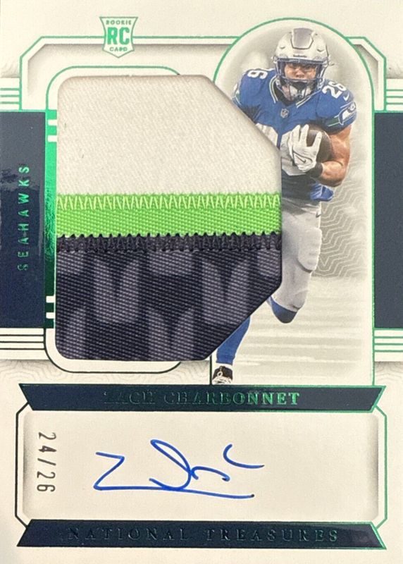 This card is 1 of 38 Zach Charbonnet's card variations in the 2023 National Treasures set being tracked by Sports Card Investor, including Rookie Patch Auto - Green Jersey Number (/26), Crossover Rookie Patch Autographs /99, Rookie Material Signatures /99, Rookie Patch Auto /99, and Rookie Patch Auto - Purple /49.