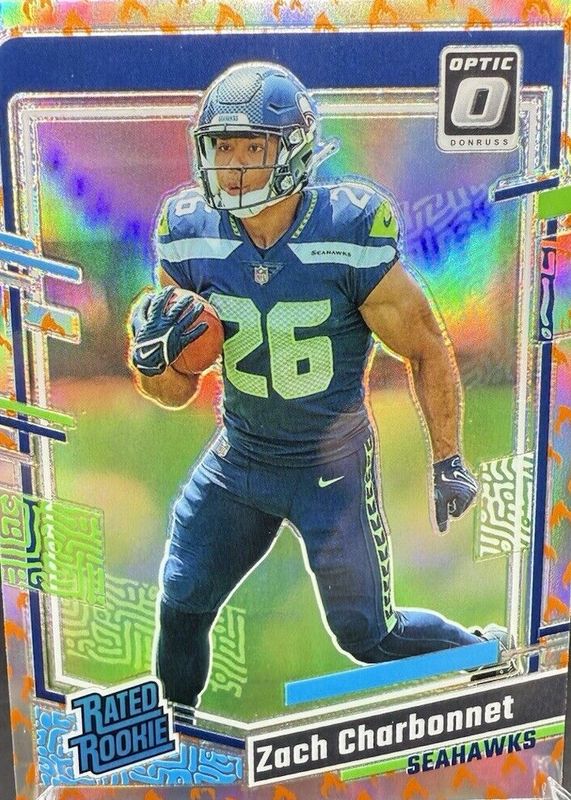 The Zach Charbonnet 2023 Optic #294 Fire /(SSP) Rookie card in Raw condition has not changed in price in the last 30 days and was last sold for $3.00 .