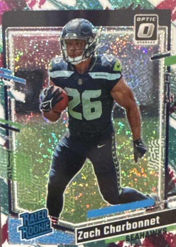 This card is 1 of 58 Zach Charbonnet's card variations in the 2023 Optic set being tracked by Sports Card Investor, including Base, Blue Hyper, Blue Scope, Green Hyper, and Green Velocity.