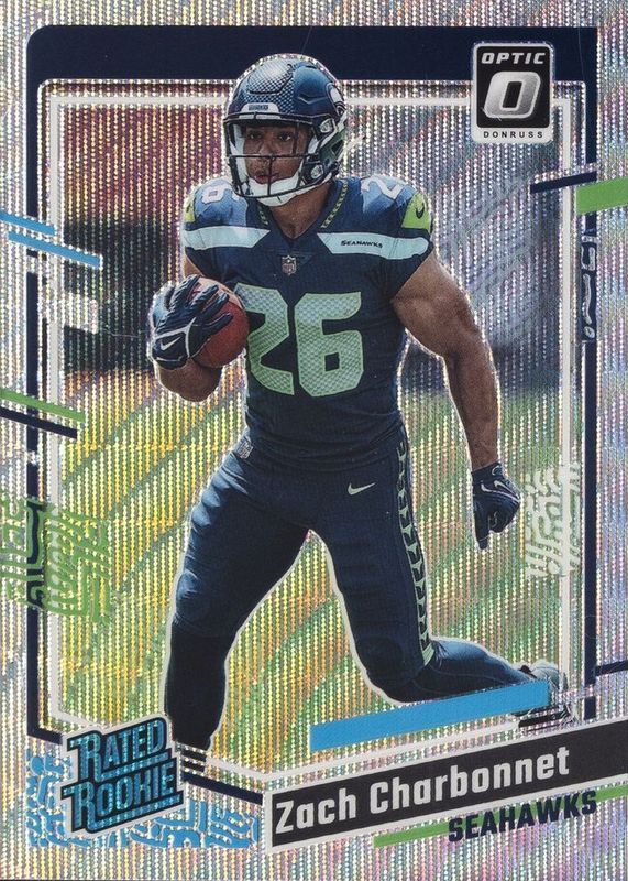 The Zach Charbonnet 2023 Optic #294 Wave /300 Rookie card in Raw condition has not changed in price in the last 30 days and was last sold for $3.00 .