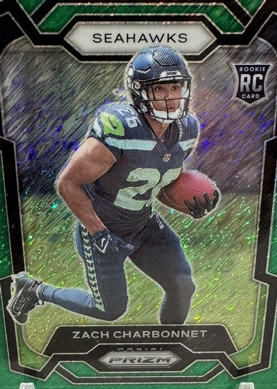 The Zach Charbonnet 2023 Prizm #392 Green Shimmer /5 Rookie card in Raw condition has not changed in price in the last 30 days and was last sold for $82.01 .
