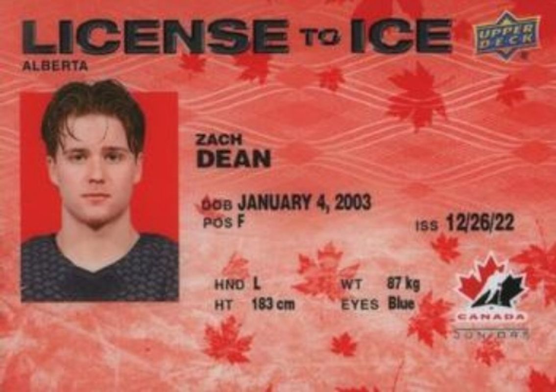 The Zach Dean 2023 Upper Deck Team Canada Juniors #LI-4 License to Ice - Red /23 card is 1 of 71 Zach Dean's card variations in the 2023 Upper Deck Team Canada Juniors set being tracked by Sports Card Investor, including #7 Base, #133 Base, #71 Base, #7 Clear Cut, and #133 Clear Cut.