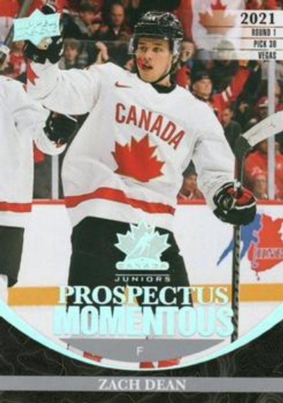 The Zach Dean 2023 Upper Deck Team Canada Juniors #PM-43 Prospectus Momentous card is 1 of 71 Zach Dean's card variations in the 2023 Upper Deck Team Canada Juniors set being tracked by Sports Card Investor, including #7 Base, #133 Base, #71 Base, #7 Clear Cut, and #133 Clear Cut.