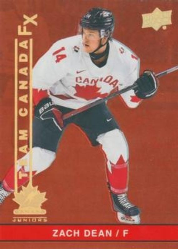 The Zach Dean 2023 Upper Deck Team Canada Juniors #FX-8 Team Canada FX card is 1 of 71 Zach Dean's card variations in the 2023 Upper Deck Team Canada Juniors set being tracked by Sports Card Investor, including #7 Base, #133 Base, #71 Base, #7 Clear Cut, and #133 Clear Cut.