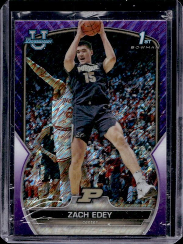 The Zach Edey 2022 Bowman Chrome University #79 Purple Shimmer Refractor card is 1 of 37 Zach Edey's card variations in the 2022 Bowman Chrome University set being tracked by Sports Card Investor, including Base, Pink Refractor, Refractor, Purple Mini-Diamond Refractor /399, and Purple Refractor /399.