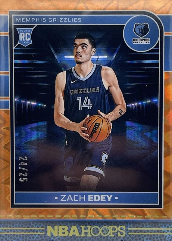 The Zach Edey 2024 Hoops #239 Orange Explosion /25 Rookie card in Raw condition has not changed in price in the last 30 days and was last sold for $49.85 .