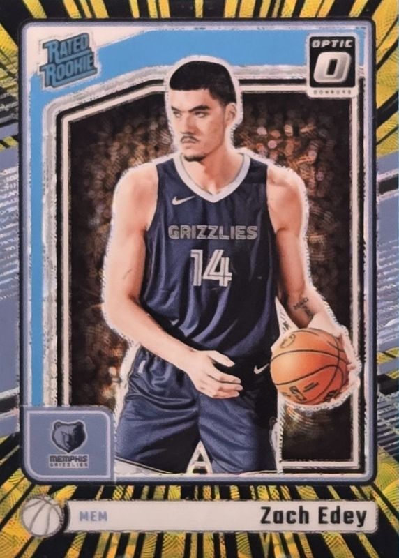 The Zach Edey 2024 Optic #288 International Electricity /75 Rookie card in Raw condition has moved up $9.00 (+138%) in the last 30 days and was last sold for $15.50 .