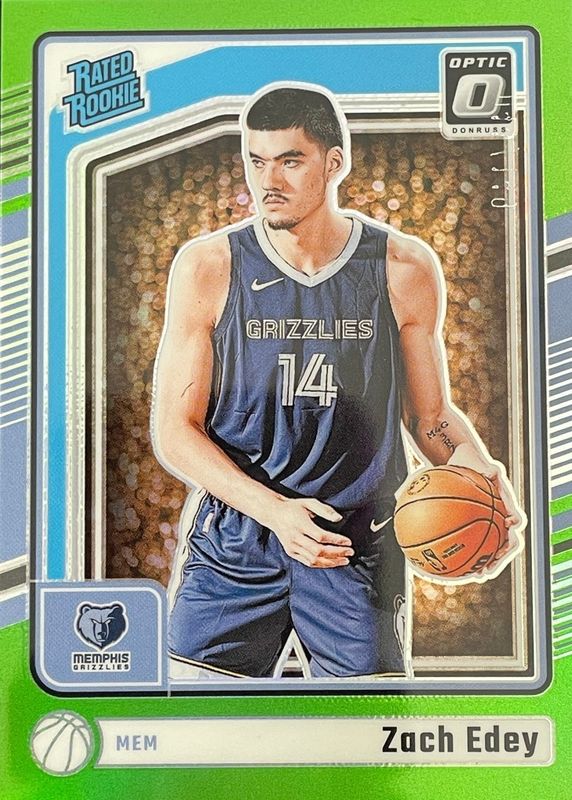 The Zach Edey 2024 Optic #288 Lime Green /149 Rookie card in Raw condition has moved up $3.00 (+100%) in the last 30 days and was last sold for $6.00 .