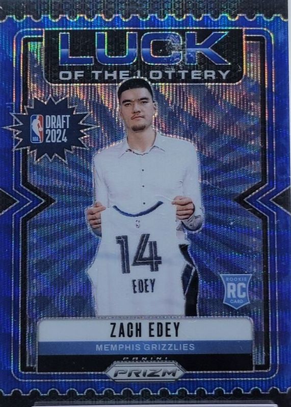 The Zach Edey 2024 Prizm #3 Luck of the Lottery - Blue Wave /175 Rookie card in Raw condition has moved up $1.75 (+35.0%) in the last 30 days and was last sold for $6.75 .