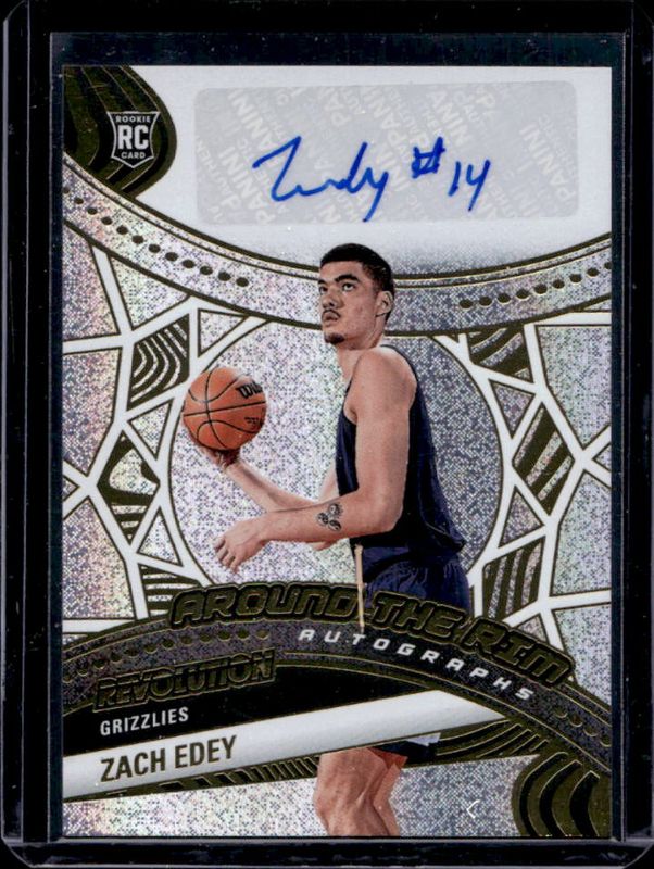 The Zach Edey 2024 Revolution #ATR-ZAC Around the Rim Autographs Rookie card is 1 of 81 Zach Edey's card variations in the 2024 Revolution set being tracked by Sports Card Investor, including Base, Astro, Blue Storm, Chinese New Year, and Fractal.