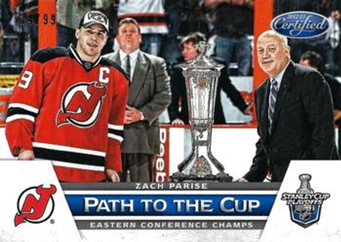 The Zach Parise 2012 Certified #PCCT1 Path to the Cup Conference Trophy /99 card is 1 of 18 Zach Parise's card variations in the 2012 Certified set being tracked by Sports Card Investor, including Base /999, Mirror Red /100, Mirror Hot Box /75, Mirror Blue /50, and Mirror Gold /25.