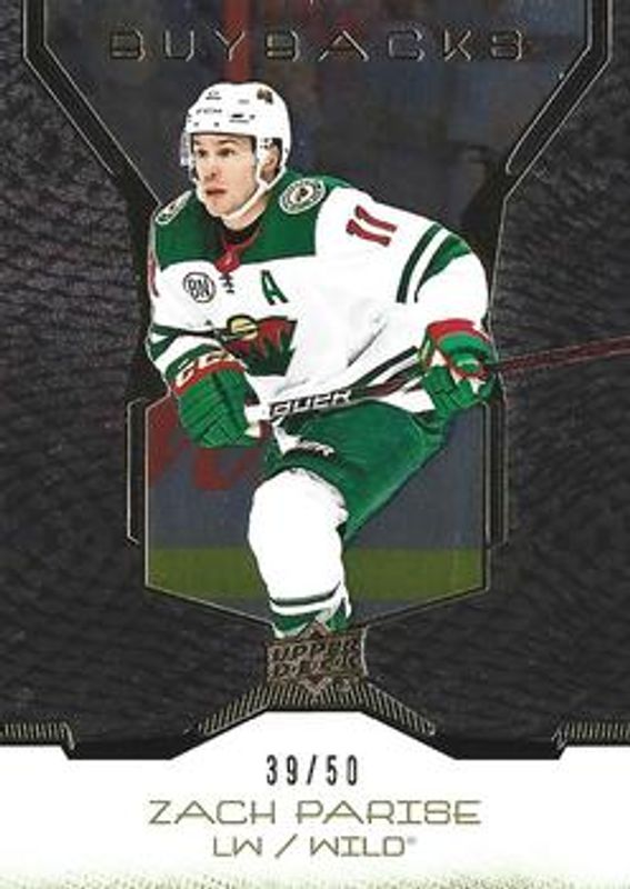 The Zach Parise 2019 Upper Deck Buybacks #12 Gold /50 card is 1 of 5 Zach Parise's card variations in the 2019 Upper Deck Buybacks set being tracked by Sports Card Investor, including Base /199, Emerald /25, Purple /1, and Buybacks.