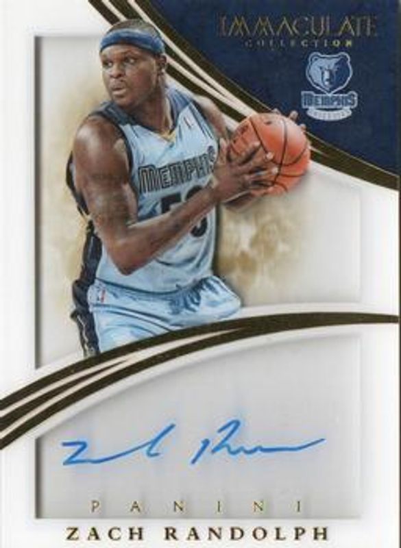 The Zach Randolph 2014 Immaculate #SH-ZR Shadowbox Signatures /49 card is 1 of 23 Zach Randolph's card variations in the 2014 Immaculate set being tracked by Sports Card Investor, including Base /99, Red /25, Holo Gold /10, Platinum /1, and Dual Memorabilia /99.