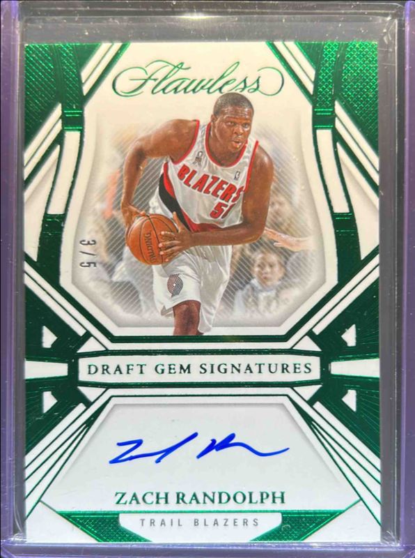 The Zach Randolph 2023 Flawless #DGS-ZBO Draft Gem Signatures - Emerald /5 card is 1 of 14 Zach Randolph's card variations in the 2023 Flawless set being tracked by Sports Card Investor, including Draft Gem Signatures /25, Flawless Shade Signatures /25, Draft Gem Signatures - Ruby /15, Flawless Shade Signatures - Ruby /15, and Draft Gem Signatures - Gold /10.
