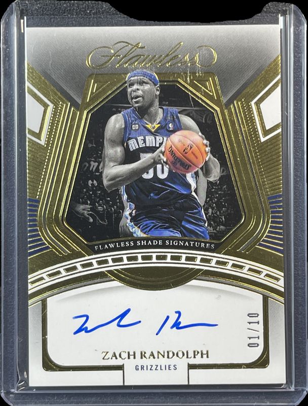 The Zach Randolph 2023 Flawless #FSS-ZRM Flawless Shade Signatures - Gold /10 card is 1 of 14 Zach Randolph's card variations in the 2023 Flawless set being tracked by Sports Card Investor, including Draft Gem Signatures /25, Flawless Shade Signatures /25, Draft Gem Signatures - Ruby /15, Flawless Shade Signatures - Ruby /15, and Draft Gem Signatures - Gold /10.