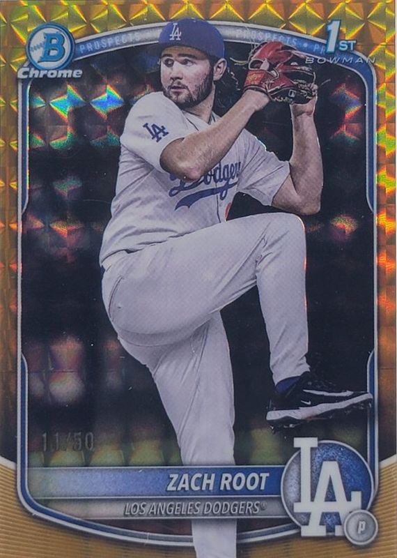 The Zach Root 2025 Bowman Draft #BDC-22 Chrome - Gold Geometric Refractor /50 (1st) card in Raw condition has moved up $6.51 (+35.2%) in the last 30 days and was last sold for $25.00 .