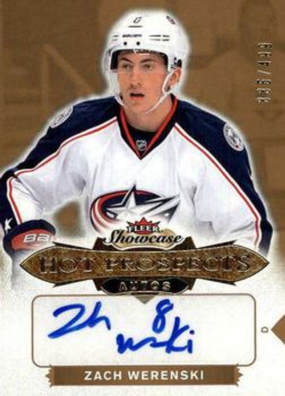 The Zach Werenski 2016 Fleer Showcase #165 Base /399 Rookie card is 1 of 19 Zach Werenski's card variations in the 2016 Fleer Showcase set being tracked by Sports Card Investor, including Hot Prospects Autographs Patch /135, Red Glow /25, Hot Prospects Autographs Patch White Hot /10, White Hot /5, and EX 2017.