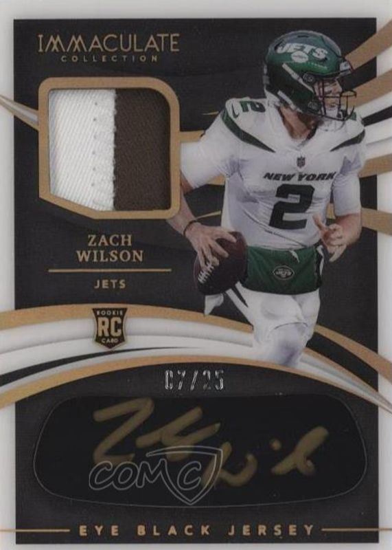 The Zach Wilson 2021 Immaculate #REB-ZW Immaculate Rookie Eye Black Jersey Autographs - Gold (/25) card in Raw condition has not changed in price in the last 30 days and was last sold for $100.00 .