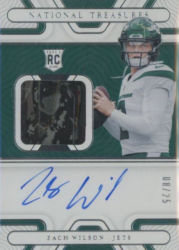 This card is 1 of 57 Zach Wilson's card variations in the 2021 National Treasures set being tracked by Sports Card Investor, including Rookie Patch Auto /99, Rookie Patch Auto - Green Jersey Number (/2), Rookie Patch Auto - Purple /49, Rookie Patch Auto - Holo Silver /25, and Rookie Patch Auto - Stars & Stripes Holo Silver /25.