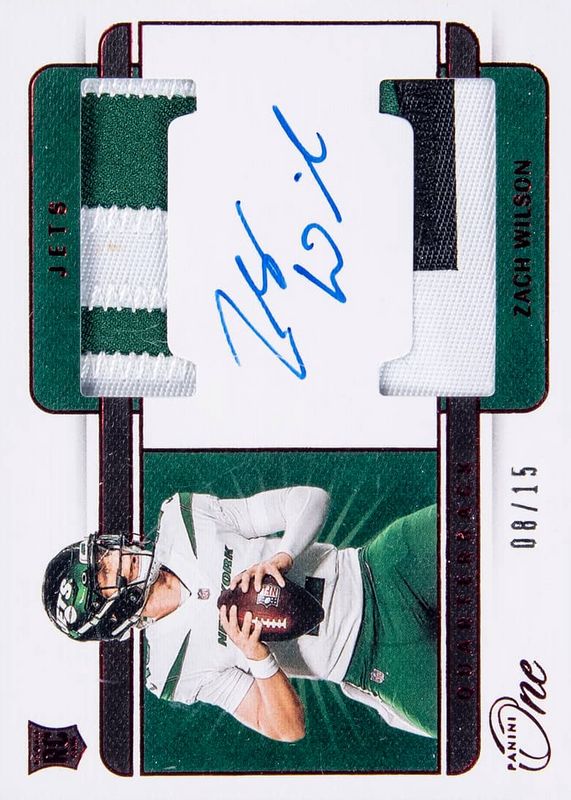 2021 Panini One ZACH WILSON Rookie Dual Patch Auto Red RPA #’d 10/15 RC Jets