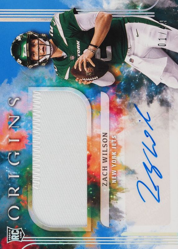 The Zach Wilson 2021 Origins #152 Rookie Jumbo Jersey Autographs - Blue /49 card in Raw condition has not changed in price in the last 30 days and was last sold for $20.20 .