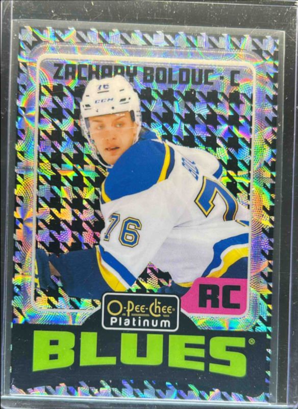 The Zachary Bolduc 2024 O-Pee-Chee Platinum #R74 Retro - Houndstooth /15 Rookie card is 1 of 26 Zachary Bolduc's card variations in the 2024 O-Pee-Chee Platinum set being tracked by Sports Card Investor, including Base, Neon Yellow Surge, Pink Magma, Rainbow, and Sunset.