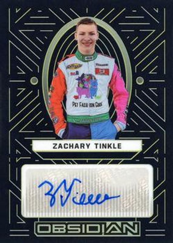 The Zachary Tinkle 2023 Chronicles NASCAR #ZT Obsidian Signatures Electric Etch Yellow /10 card is 1 of 5 Zachary Tinkle's card variations in the 2023 Chronicles NASCAR set being tracked by Sports Card Investor, including Obsidian Signatures, Obsidian Signatures Electric Etch - Purple /49, Obsidian Signatures Electric Etch - Pink /25, and Obsidian Signatures Electric Etch White Mojo /1.