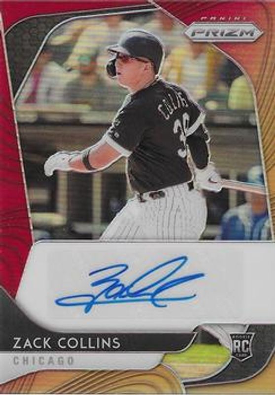 The Zack Collins 2020 Prizm #RA-ZC Rookie Autographs - Red-Orange /25 card is 1 of 60 Zack Collins' card variations in the 2020 Prizm set being tracked by Sports Card Investor, including Base, Blue, Carolina Blue, Cosmic Haze, and Green.