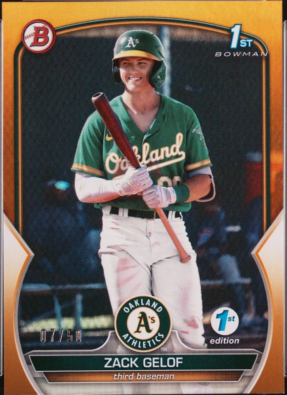 The Zack Gelof 2023 Bowman 1st Edition #BPPF-1 Gold Foil /50 card is 1 of 9 Zack Gelof's card variations in the 2023 Bowman 1st Edition set being tracked by Sports Card Investor, including Base, Sky Blue Foil, Blue Foil /150, Yellow Foil /75, and Orange Foil /25.