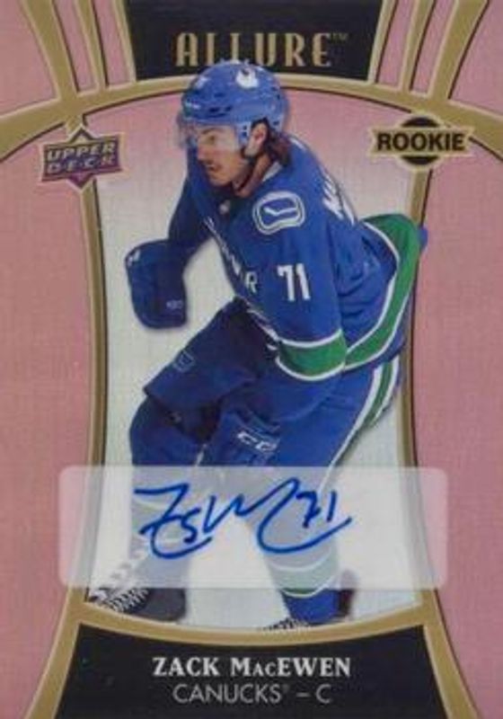 The Zack MacEwen 2019 Upper Deck Allure #126 Pink Diamond Autographs /59 Rookie card is 1 of 39 Zack MacEwen's card variations in the 2019 Upper Deck Allure set being tracked by Sports Card Investor, including #68 Base, #126 Base, #68 Pewter, #126 Pink Diamond, and #68 Red Rainbow.