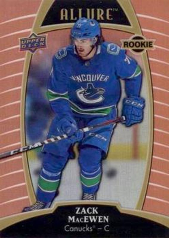 The Zack MacEwen 2019 Upper Deck Allure #68 Sunset Rookie card is 1 of 39 Zack MacEwen's card variations in the 2019 Upper Deck Allure set being tracked by Sports Card Investor, including #68 Base, #126 Base, #68 Pewter, #126 Pink Diamond, and #68 Red Rainbow.
