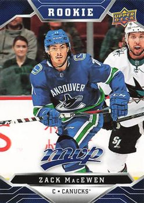 The Zack MacEwen 2019 Upper Deck MVP #246 Blue Rookie card is 1 of 13 Zack MacEwen's card variations in the 2019 Upper Deck MVP set being tracked by Sports Card Investor, including Base, Gold Script, Silver Script, Super Script /25, and Super Script Black /5.