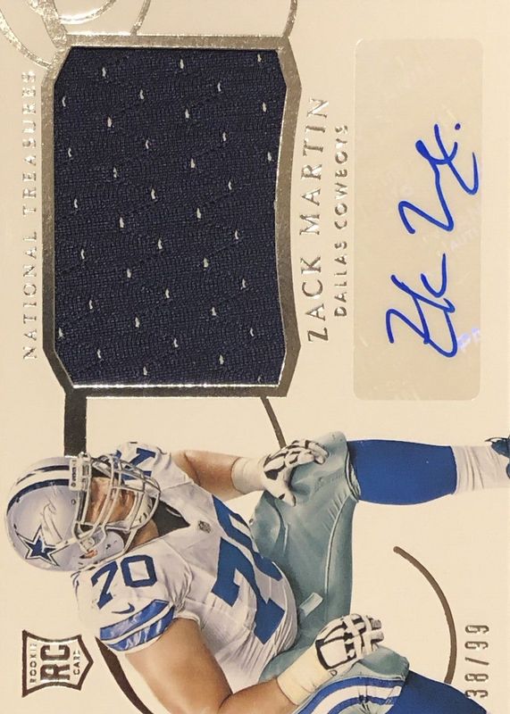 This card is 1 of 9 Zack Martin's card variations in the 2014 National Treasures set being tracked by Sports Card Investor, including Rookie Patch Auto - Numbers (/70), Rookie Patch Auto - Silver /25, Rookie Patch Auto - Gold /10, Rookie Patch Auto - Black /5, and Rookie Patch Auto - Blue /1.