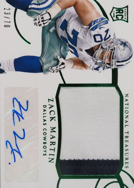 This card is 1 of 9 Zack Martin's card variations in the 2014 National Treasures set being tracked by Sports Card Investor, including Rookie Patch Auto /99, Rookie Patch Auto - Silver /25, Rookie Patch Auto - Gold /10, Rookie Patch Auto - Black /5, and Rookie Patch Auto - Blue /1.