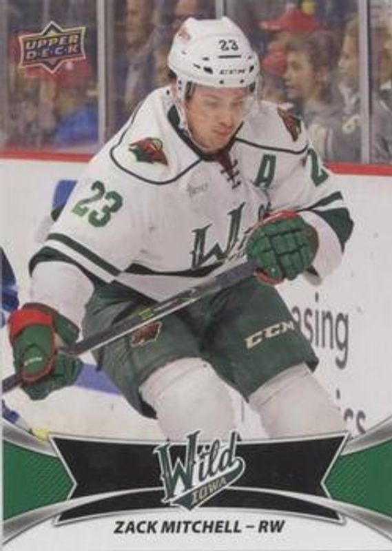 The Zack Mitchell 2016 Upper Deck AHL #26 Green Rookie card is 1 of 7 Zack Mitchell's card variations in the 2016 Upper Deck AHL set being tracked by Sports Card Investor, including Base, Red, Printing Plates Black /1, Printing Plates Cyan /1, and Printing Plates Magenta /1.