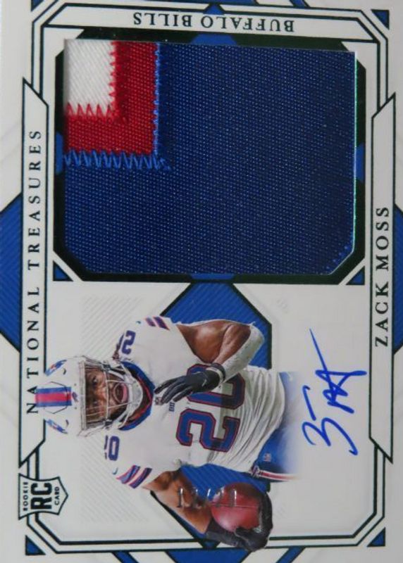 Zack Moss' Football cards are available in at least 9 sets. Zack Moss' biggest 7-day price movers are 2020 National Treasures #191 Rookie Patch Auto - Green Jersey Number (/20), 2020 Select #369 Field Level Tie-Dye Die-Cut /25, and 2020 Contenders #131 Rookie Ticket Auto.