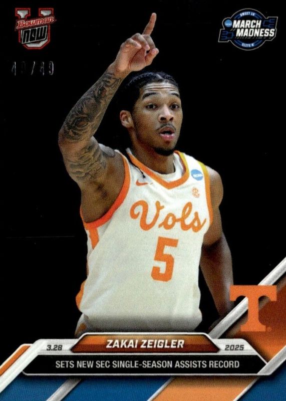 This card is 1 of 6 Zakai Zeigler's card variations in the 2024 Bowman U Now set being tracked by Sports Card Investor, including Base (Print Run: 500), Purple /25, Red /10, Orange /5, and Gold /1.