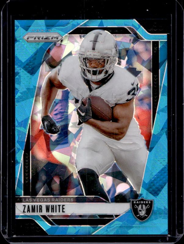The Zamir White 2024 Prizm #149 Blue Ice /99 card is 1 of 83 Zamir White's card variations in the 2024 Prizm set being tracked by Sports Card Investor, including Base, Choice Blue Yellow Green, Choice Silver, Disco, and Green.