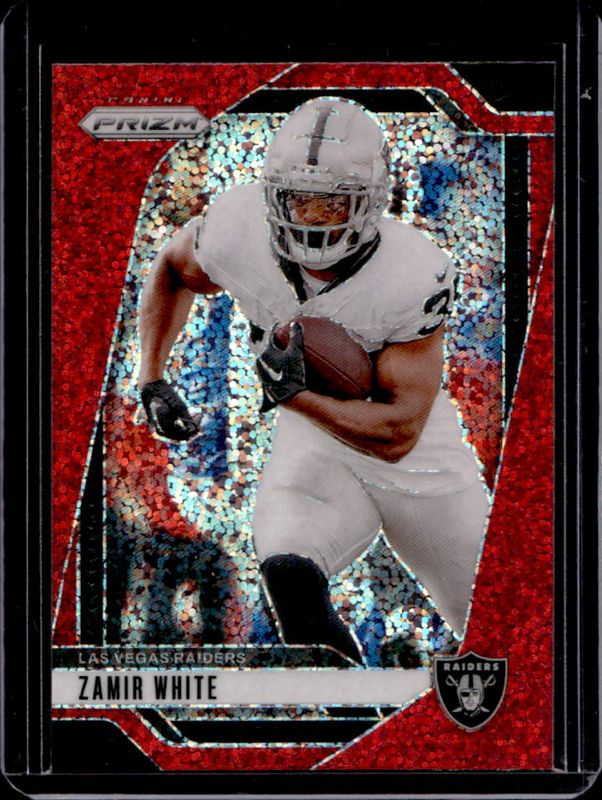 The Zamir White 2024 Prizm #149 Red Sparkle /(SSP) card is 1 of 83 Zamir White's card variations in the 2024 Prizm set being tracked by Sports Card Investor, including Base, Choice Blue Yellow Green, Choice Silver, Disco, and Green.