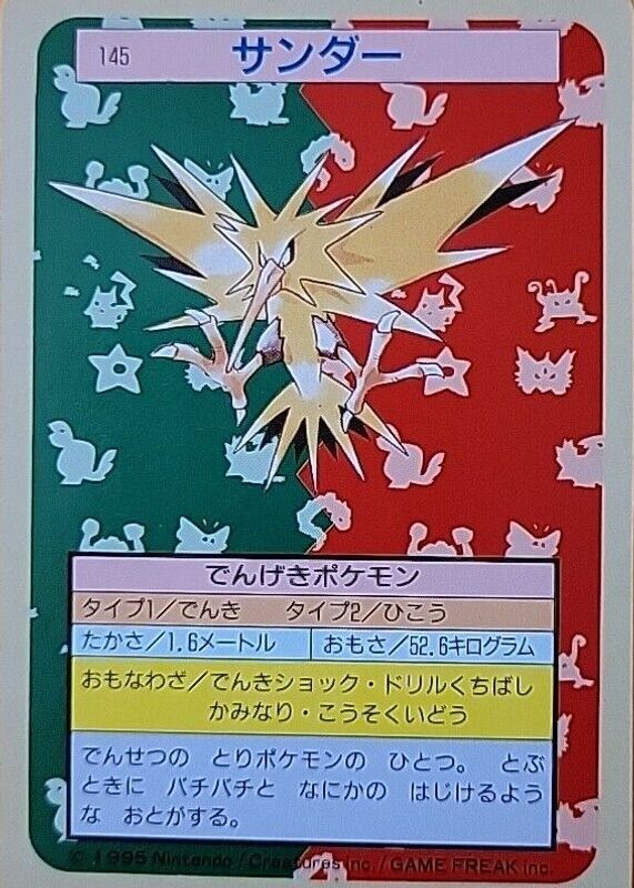 This card is 1 of 2 Zapdos' card variations in the 1997 Japanese Topsun set being tracked by Sports Card Investor, including Blue Back (1st Edition).