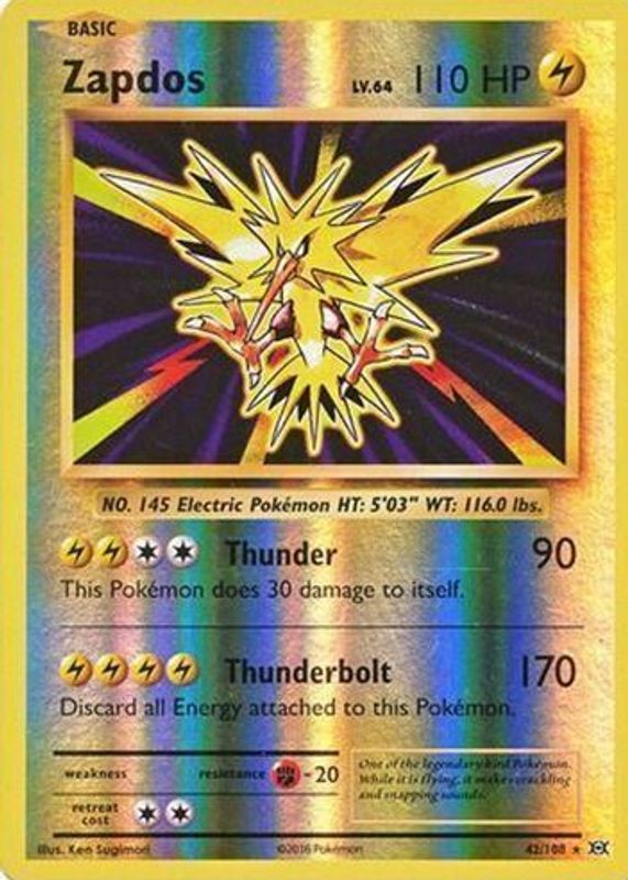 The Zapdos 2016 XY: Evolutions #42 Reverse Holo card in Raw TCG (Near Mint) condition has moved down -$0.51 (-11.3%) in the last 30 days and was last sold for $3.99 .