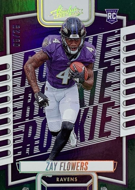 The Zay Flowers 2023 Absolute #111 Green Spectrum /25 Rookie card in Raw condition has not changed in price in the last 30 days and was last sold for $11.01 .