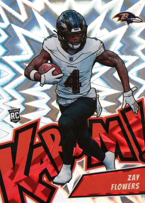The Zay Flowers 2023 Absolute #K16 Kaboom! (Vertical) Rookie card in Raw condition has not changed in price in the last 30 days and was last sold for $562.00 .