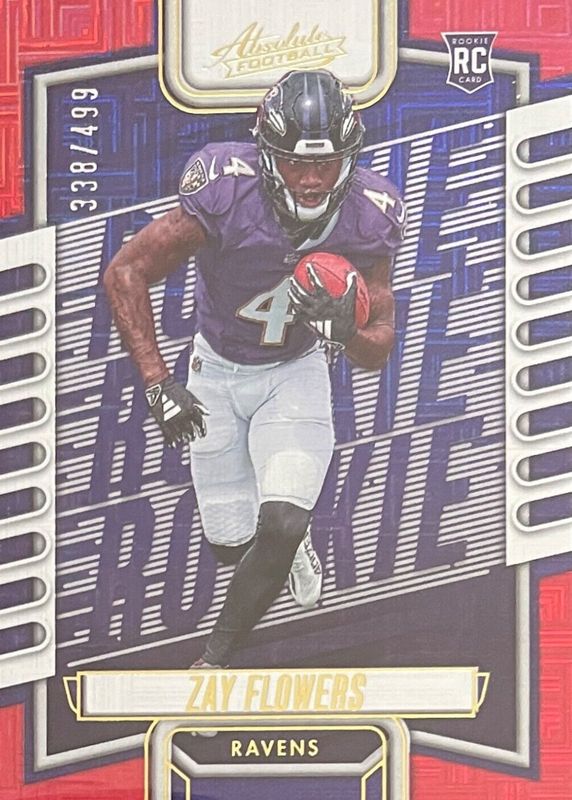 The Zay Flowers 2023 Absolute #111 Red Squares /499 Rookie card in Raw condition has not changed in price in the last 30 days and was last sold for $10.00 .
