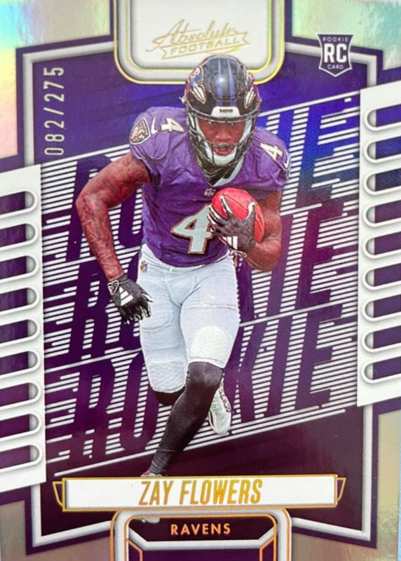 The Zay Flowers 2023 Absolute #111 Spectrum /275 Rookie card in Raw condition has not changed in price in the last 30 days and was last sold for $1.99 .