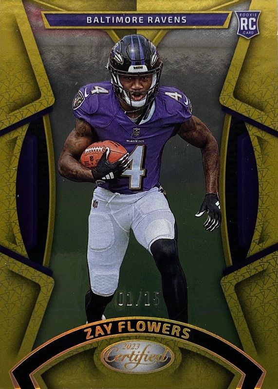 The Zay Flowers 2023 Certified #185 FOTL Mirror Gold /15 Rookie card in Raw condition has not changed in price in the last 30 days and was last sold for $8.50 .