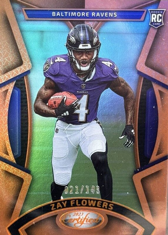 The Zay Flowers 2023 Certified #185 Mirror Orange /149 Rookie card in Raw condition has not changed in price in the last 30 days and was last sold for $1.75 .