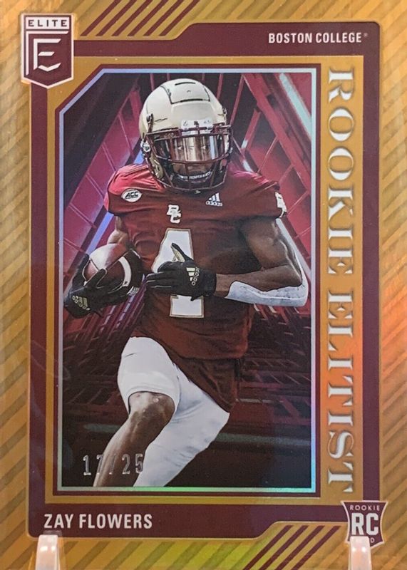 The Zay Flowers 2023 Elite #RE-12 Rookie Elitist - Orange /25 card in Raw condition has not changed in price in the last 30 days and was last sold for $2.50 .