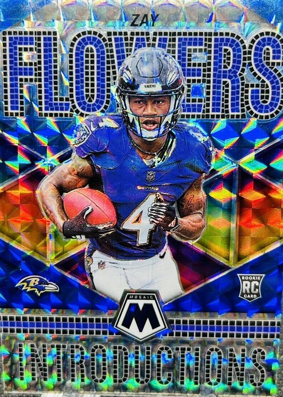 The Zay Flowers 2023 Mosaic #I-8 Introductions - Blue /99 Rookie card in Raw condition has not changed in price in the last 30 days and was last sold for $13.50 .