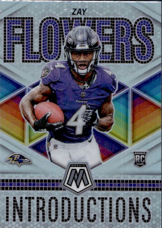 The Zay Flowers 2023 Mosaic #I-8 Introductions - Silver Rookie card in Raw condition has not changed in price in the last 30 days and was last sold for $2.79 .